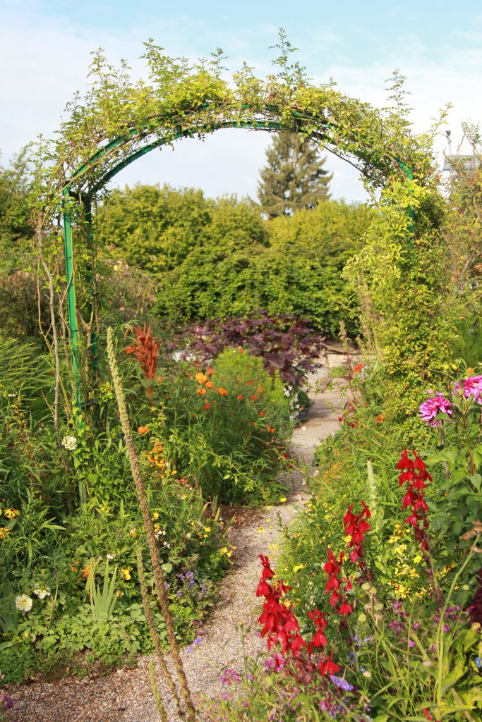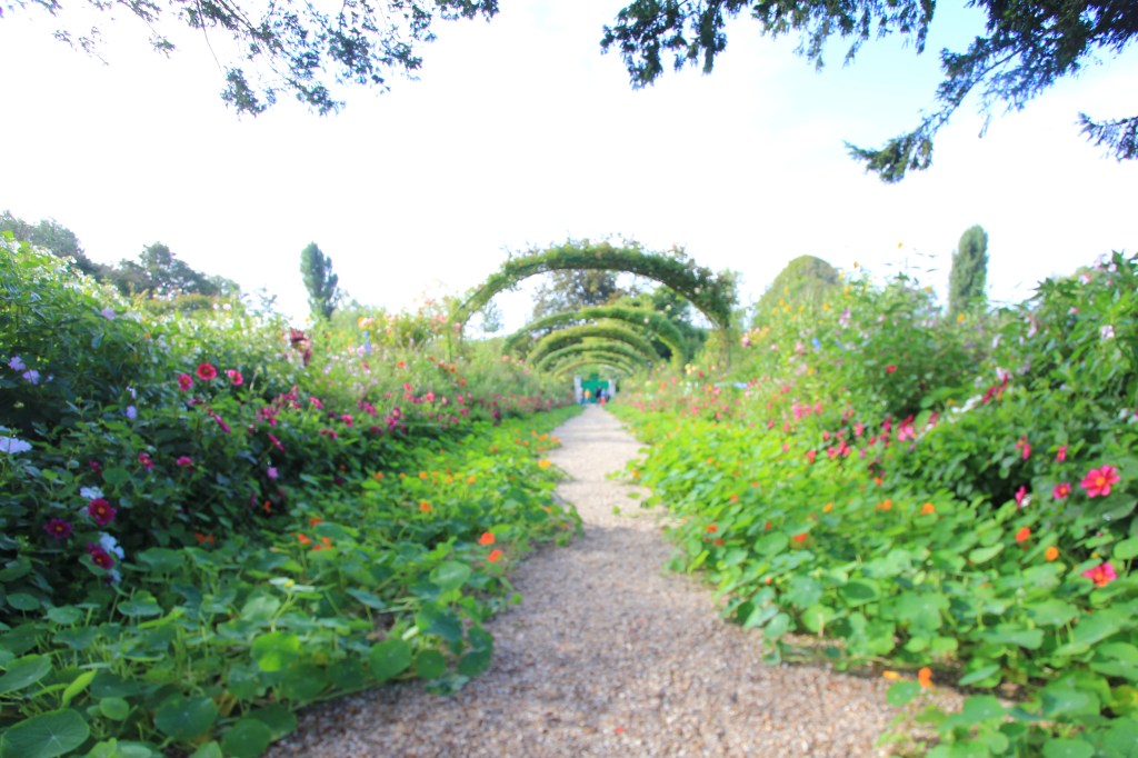 Monet designed and instructed his landscapers daily. He selected the flowers and by the time he was more prosperous, he employed 7 full-time gardeners. Today, the Fondation Claude Monet organization maintains the grounds, gardens, and home of Claude Monet and still employs 10 full-time gardeners. This Clos Normand garden, near the house, is laid out in grid fashion with several different flower arranged within the beds. A with a central walkway leading from the house has arches that allow the greenery to continue up to the sky above you.
