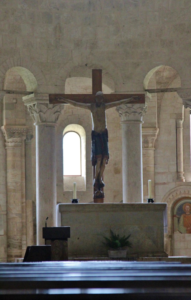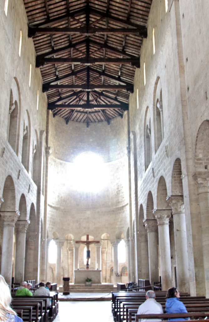 I was more than a little sad to be leaving Montepulciano so soon, but that indeed leaves more for next time. The bus picked up speed and we all settled in for a 30-minute trip to our next spot near our lunch destination. The Abbey of Sant’ Antimo is thought to have been founded in the 9th century but the church was saw “only” dated from the 12th. The abbey is set off to itself a mile or so away from the nearest village. Once one of the richest churches in the region much of its holdings and wealth have been decimated.