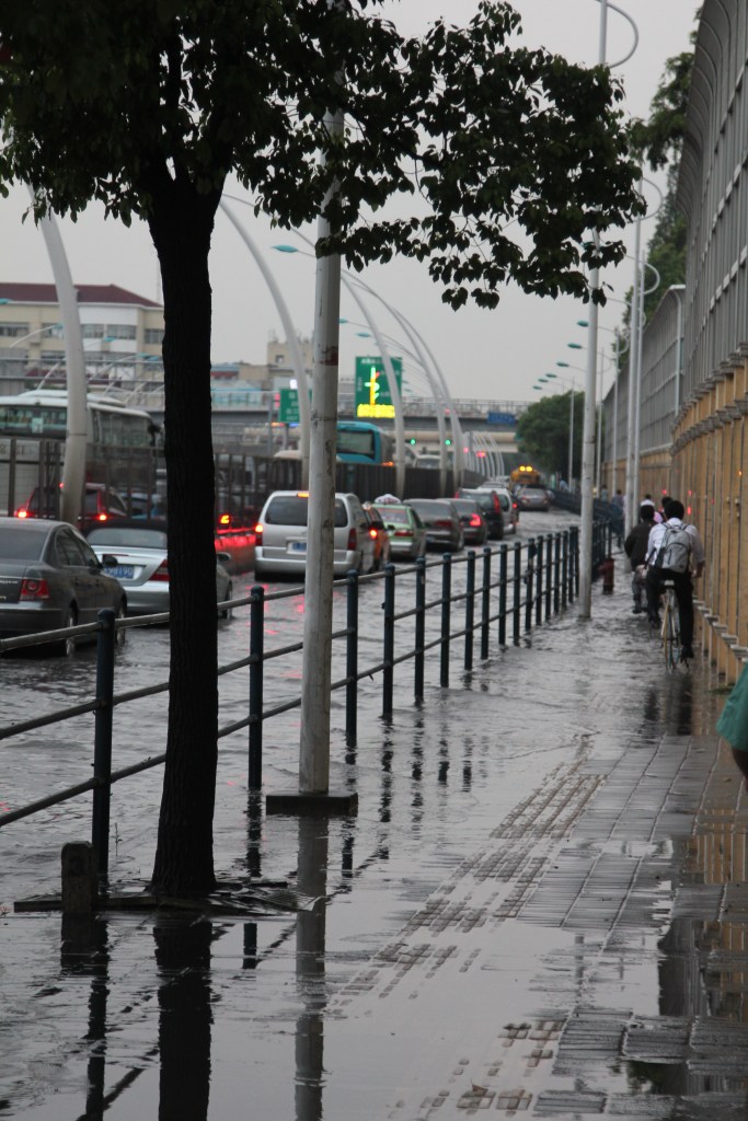 My travel to Shanghai wasn’t nearly as dramatic. I volunteered to fly American Airlines out of Chicago arriving 13 hours later into Pudong International Airport. My arrival in Shanghai was shortly after a big storm so there was some localized flooding, lots of water in the streets and the sky was still overcast. This limited my early excursions to taking a few pictures near the Hilton but we planned to hit the Bund area and take in the sights that evening.